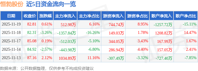 11月19日的资金流向数据方面,主力资金净流入512.98万元,占总成交额6.16%,游资资金净流入744.74万元,占总成交额8.95%,散户资金净流出1257.72万元,占总成交额15.11%。