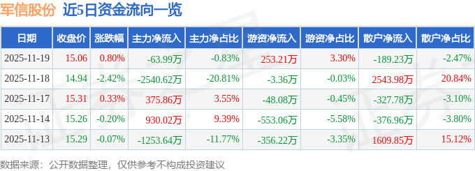 证券之星消息,截至2025年11月19日收盘,军信股份(301109)报收于15.06元,上涨0.8%,换手率2.29%,成交量5.11万手,成交额7672.41万元。