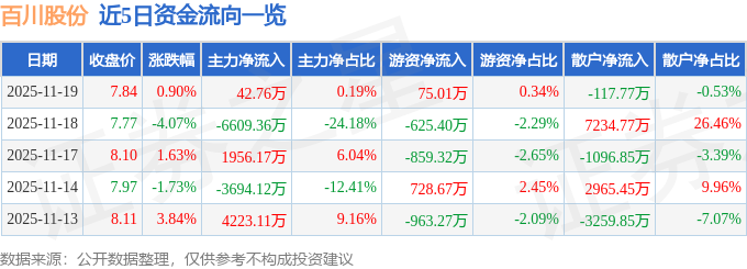 证券之星消息,截至2025年11月19日收盘,百川股份(002455)报收于7.84元,上涨0.9%,换手率5.47%,成交量28.39万手,成交额2.24亿元。