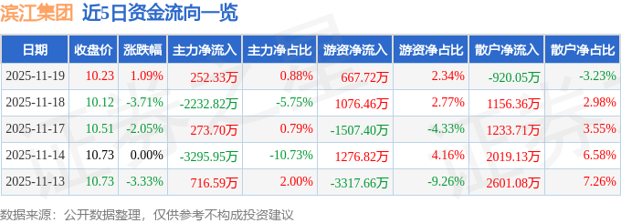 证券之星消息,截至2025年11月19日收盘,滨江集团(002244)报收于10.23元,上涨1.09%,换手率1.04%,成交量27.91万手,成交额2.85亿元。