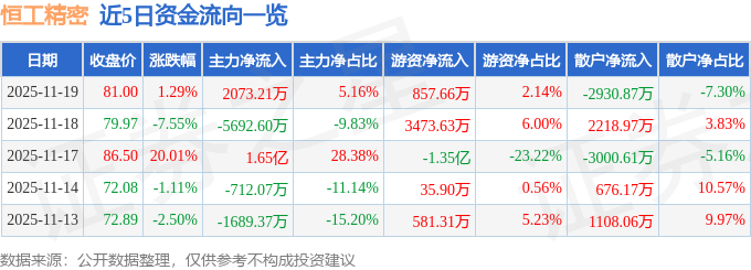 证券之星消息,截至2025年11月19日收盘,恒工精密(301261)报收于81.0元,上涨1.29%,换手率13.18%,成交量4.94万手,成交额4.01亿元。