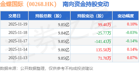 证券之星消息,11月19日南向资金增持99.4万股金蝶国际(00268.HK)。近5个交易日中,获南向资金增持的有3天,累计净增持139.4万股。近20个交易日中,获南向资金增持的有13天,累计净增持2658.5万股。截至目前,南向资金持有金蝶国际(00268.HK)9.85亿股,占公司已发行普通股的27.75%。