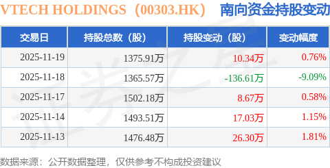 证券之星消息,11月19日南向资金增持10.34万股VTECH HOLDINGS(00303.HK)。近5个交易日中,获南向资金减持的有1天,累计净减持74.27万股。近20个交易日中,获南向资金增持的有16天,累计净增持12.13万股。截至目前,南向资金持有VTECH HOLDINGS(00303.HK)1375.91万股,占公司已发行普通股的5.42%。