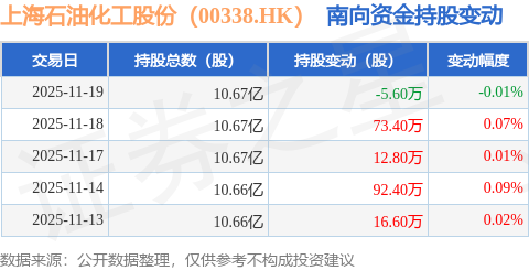 证券之星消息,11月19日南向资金减持5.6万股上海石油化工股份(00338.HK)。近5个交易日中,获南向资金增持的有4天,累计净增持189.6万股。近20个交易日中,获南向资金增持的有11天,累计净增持66.8万股。截至目前,南向资金持有上海石油化工股份(00338.HK)10.67亿股,占公司已发行普通股的33.2%。