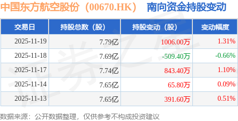 证券之星消息,11月19日南向资金增持1006.0万股中国东方航空股份(00670.HK)。近5个交易日中,获南向资金增持的有4天,累计净增持1797.4万股。近20个交易日中,获南向资金增持的有14天,累计净增持8482.75万股。截至目前,南向资金持有中国东方航空股份(00670.HK)7.79亿股,占公司已发行普通股的15.37%。