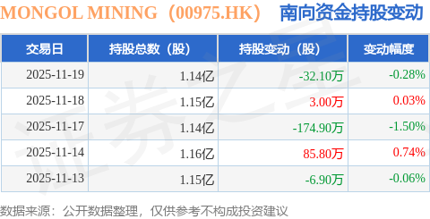 证券之星消息,11月19日南向资金减持32.1万股MONGOL MINING(00975.HK)。近5个交易日中,获南向资金减持的有3天,累计净减持125.1万股。近20个交易日中,获南向资金减持的有11天,累计净减持55.59万股。截至目前,南向资金持有MONGOL MINING(00975.HK)1.14亿股,占公司已发行普通股的10.95%。