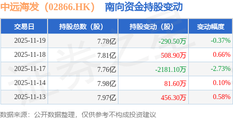 证券之星消息,11月19日南向资金减持290.5万股中远海发(02866.HK)。近5个交易日中,获南向资金减持的有2天,累计净减持1424.8万股。近20个交易日中,获南向资金减持的有11天,累计净减持2316.9万股。截至目前,南向资金持有中远海发(02866.HK)7.78亿股,占公司已发行普通股的22.56%。