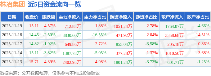 证券之星消息,截至2025年11月19日收盘,株冶集团(600961)报收于15.11元,上涨4.57%,换手率3.38%,成交量25.42万手,成交额3.78亿元。