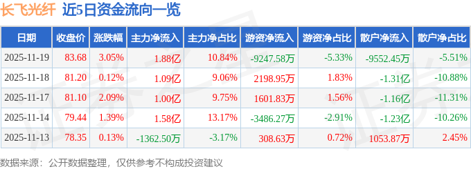 证券之星消息,截至2025年11月19日收盘,长飞光纤(601869)报收于83.68元,上涨3.05%,换手率5.11%,成交量20.77万手,成交额17.34亿元。