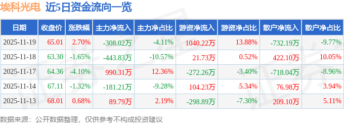 证券之星消息,截至2025年11月19日收盘,埃科光电(688610)报收于65.01元,上涨2.7%,换手率2.8%,成交量1.15万手,成交额7496.82万元。