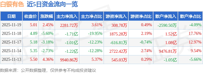 证券之星消息,截至2025年11月19日收盘,白银有色(601212)报收于5.01元,上涨2.45%,换手率1.73%,成交量127.79万手,成交额6.33亿元。
