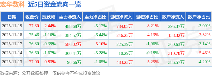 证券之星消息,截至2025年11月19日收盘,宏华数科(688789)报收于77.3元,上涨2.44%,换手率0.7%,成交量1.25万手,成交额9550.32万元。