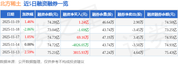 证券之星消息,截至2025年11月19日收盘,北方稀土(600111)报收于46.57元,上涨1.46%,换手率2.15%,成交量77.84万手,成交额36.06亿元。
