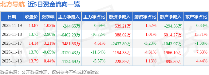 证券之星消息,截至2025年11月19日收盘,北方导航(600435)报收于13.87元,上涨1.02%,换手率1.7%,成交量25.66万手,成交额3.55亿元。