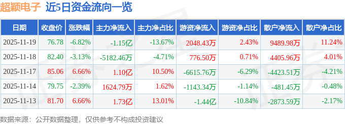 证券之星消息,截至2025年11月19日收盘,超颖电子(603175)报收于76.78元,下跌6.82%,换手率24.47%,成交量10.77万手,成交额8.44亿元。