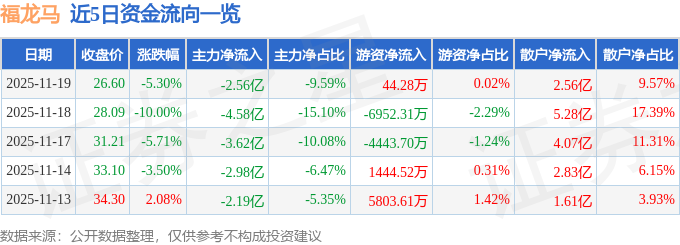 证券之星消息,截至2025年11月19日收盘,福龙马(603686)报收于26.6元,下跌5.3%,换手率24.2%,成交量100.54万手,成交额26.72亿元。