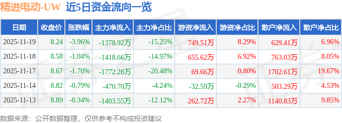 证券之星消息,截至2025年11月19日收盘,精进电动(688280)报收于8.24元,下跌3.96%,换手率2.09%,成交量10.87万手,成交额9041.66万元。