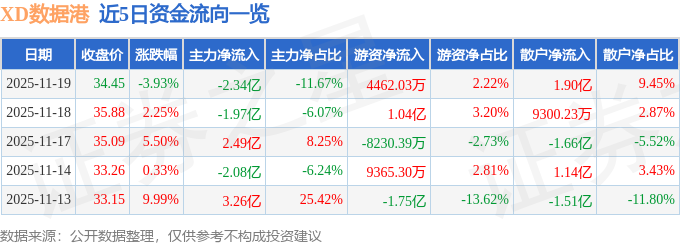 证券之星消息,截至2025年11月19日收盘,XD数据港(603881)报收于34.45元,下跌3.93%,换手率8.07%,成交量58.01万手,成交额20.09亿元。