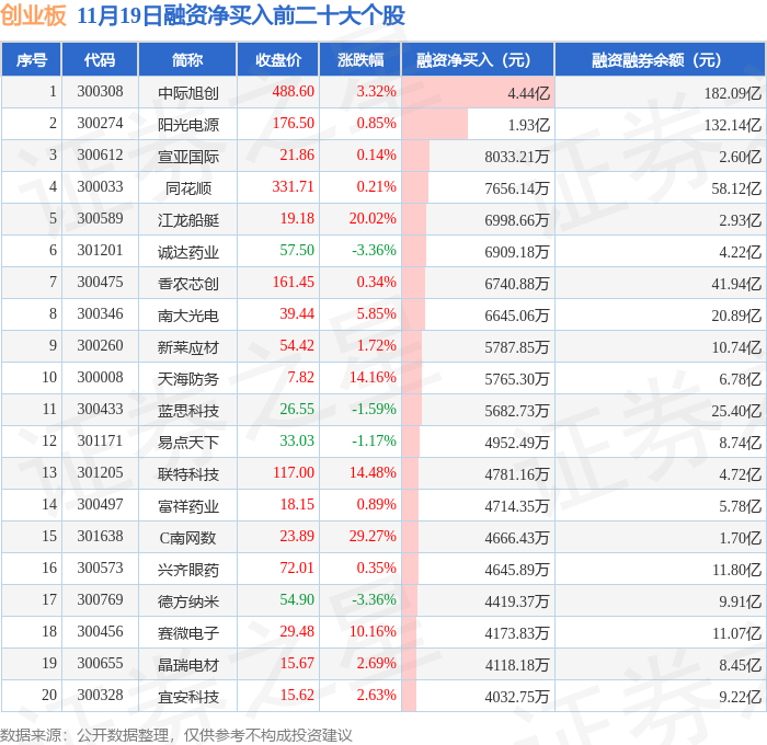 创业板融资净买入前三分别为:中际旭创(300308)融资净买入4.44亿元、阳光电源(300274)融资净买入1.93亿元、宣亚国际(300612)融资净买入8033.21万元,前20具体见下表: