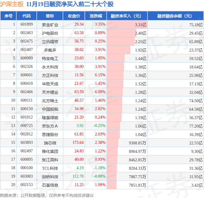 沪深主板融资净买入前三分别为:紫金矿业(601899)融资净买入3.31亿元、沪电股份(002463)融资净买入2.4亿元、立讯精密(002475)融资净买入2.25亿元,前20具体见下表: