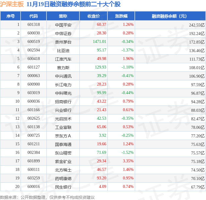 沪深主板融资融券余额前三分别为:中国平安(601318)融资融券余额242.55亿元、中信证券(600030)融资融券余额192.24亿元、贵州茅台(600519)融资融券余额172.85亿元,前20具体见下表: