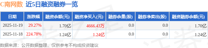 C南网数融资融券信息显示,融资方面,当日融资买入2.06亿元,融资偿还1.59亿元,融资净买入4666.43万元,连续3日净买入累计1.7亿元。融券方面,融券卖出0.0股,融券偿还0.0股,融券余量0.0股,融券余额0.0万元。融资融券余额1.7亿元。