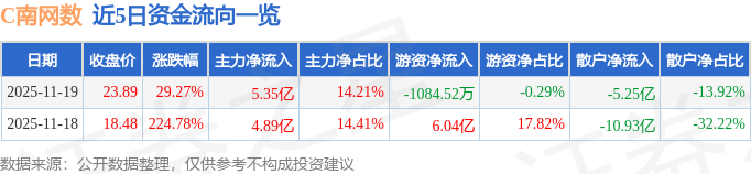 证券之星消息,截至2025年11月19日收盘,C南网数(301638)报收于23.89元,上涨29.27%,换手率74.65%,成交量175.41万手,成交额37.69亿元。