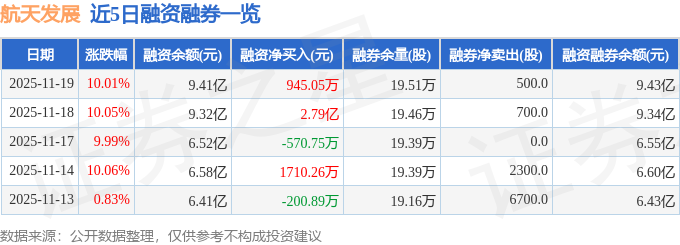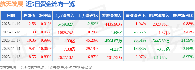 证券之星消息,截至2025年11月19日收盘,航天发展(000547)报收于12.53元,上涨10.01%,已连续涨停4天,换手率11.65%,成交量185.06万手,成交额22.89亿元。