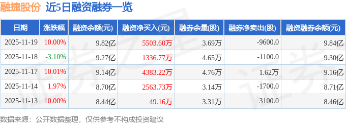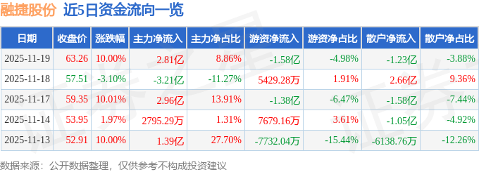 证券之星消息,截至2025年11月19日收盘,融捷股份(002192)报收于63.26元,上涨10.0%,涨停,换手率19.84%,成交量51.4万手,成交额31.73亿元。