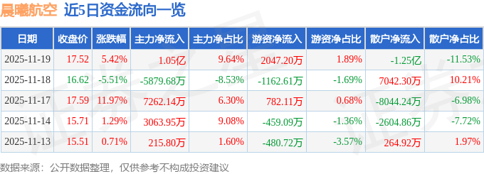 证券之星消息,截至2025年11月19日收盘,晨曦航空(300581)报收于17.52元,上涨5.42%,换手率11.3%,成交量62.16万手,成交额10.85亿元。
