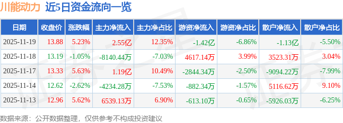 证券之星消息,截至2025年11月19日收盘,川能动力(000155)报收于13.88元,上涨5.23%,换手率7.95%,成交量146.8万手,成交额20.63亿元。