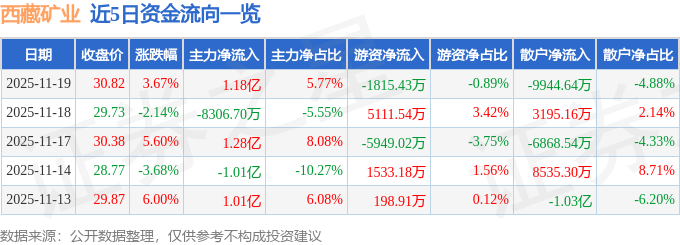证券之星消息,截至2025年11月19日收盘,西藏矿业(000762)报收于30.82元,上涨3.67%,换手率12.77%,成交量66.53万手,成交额20.38亿元。
