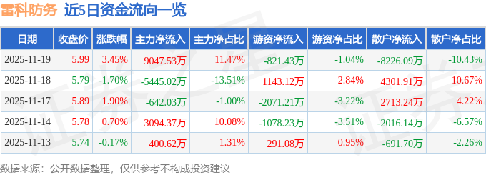 证券之星消息,截至2025年11月19日收盘,雷科防务(002413)报收于5.99元,上涨3.45%,换手率10.25%,成交量132.5万手,成交额7.89亿元。