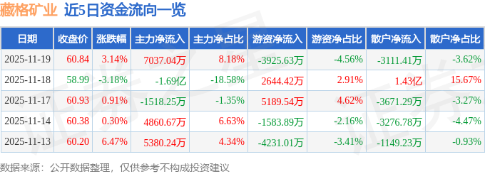 证券之星消息,截至2025年11月19日收盘,藏格矿业(000408)报收于60.84元,上涨3.14%,换手率0.9%,成交量14.18万手,成交额8.6亿元。