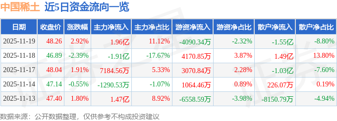 证券之星消息,截至2025年11月19日收盘,中国稀土(000831)报收于48.26元,上涨2.92%,换手率3.48%,成交量36.96万手,成交额17.63亿元。