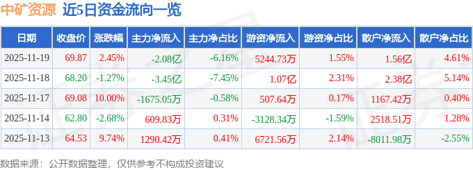 证券之星消息,截至2025年11月19日收盘,中矿资源(002738)报收于69.87元,上涨2.45%,换手率6.79%,成交量48.29万手,成交额33.82亿元。