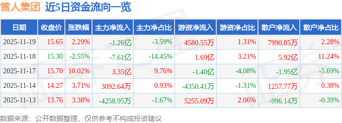 证券之星消息,截至2025年11月19日收盘,雪人集团(002639)报收于15.65元,上涨2.29%,换手率34.38%,成交量223.66万手,成交额35.04亿元。
