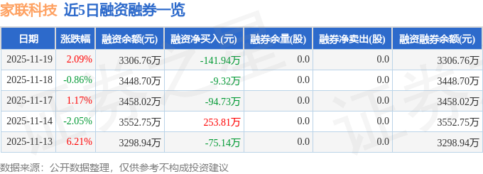 证券之星消息,截至2025年11月19日收盘,家联科技(301193)报收于20.06元,上涨2.09%,换手率2.74%,成交量3.77万手,成交额7453.43万元。