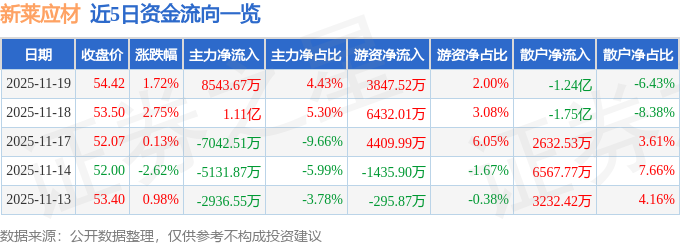 证券之星消息,截至2025年11月19日收盘,新莱应材(300260)报收于54.42元,上涨1.72%,换手率12.19%,成交量35.07万手,成交额19.28亿元。