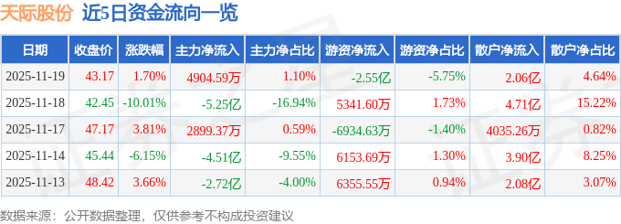 证券之星消息,截至2025年11月19日收盘,天际股份(002759)报收于43.17元,上涨1.7%,换手率21.59%,成交量108.16万手,成交额44.45亿元。