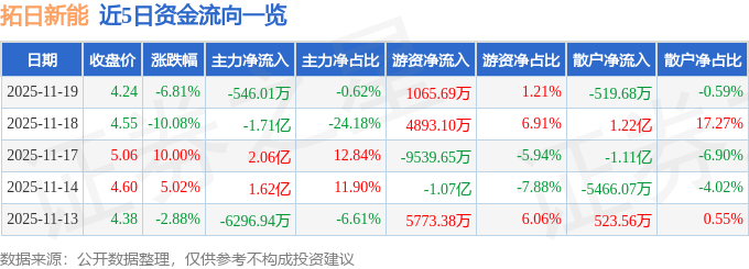 证券之星消息,截至2025年11月19日收盘,拓日新能(002218)报收于4.24元,下跌6.81%,换手率14.79%,成交量205.95万手,成交额8.77亿元。