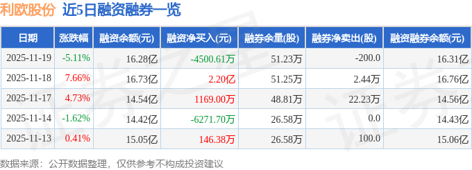 利欧股份融资融券信息显示,融资方面,当日融资买入3.44亿元,融资偿还3.89亿元,融资净偿还4500.61万元。融券方面,融券卖出0.0股,融券偿还200.0股,融券余量51.23万股,融券余额266.4万元。融资融券余额16.31亿元。
