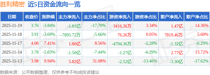 证券之星消息,截至2025年11月19日收盘,胜利精密(002426)报收于3.76元,下跌3.84%,换手率7.96%,成交量270.84万手,成交额10.23亿元。