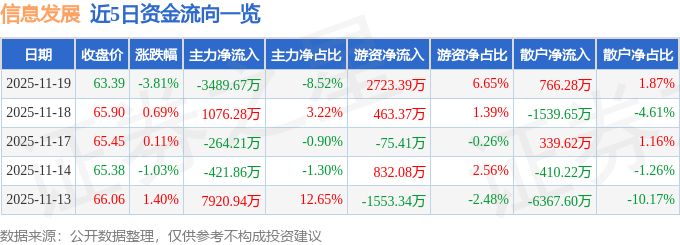 证券之星消息,截至2025年11月19日收盘,信息发展(300469)报收于63.39元,下跌3.81%,换手率2.57%,成交量6.37万手,成交额4.09亿元。