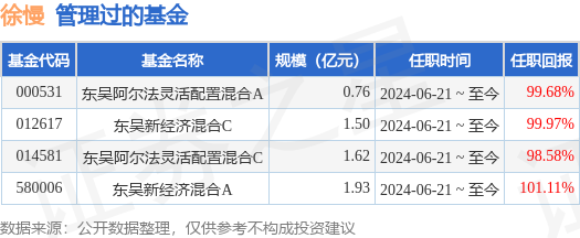 徐慢先生:中国国籍,清华大学应用经济学硕士,具备证券投资基金从业资格。曾任职五矿资本控股有限公司研究员。2022年3月加入东吴基金管理有限公司担任高级行业研究员,现任基金经理。2024年6月21日起担任东吴阿尔法灵活配置混合型证券投资基金、东吴新经济混合型证券投资基金基金经理。