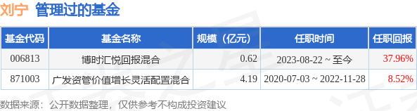 刘宁先生:研究生学历、硕士学位,2011年7月至2012年1月,在深圳中睿合银投资管理有限公司任医药行业研究员;2012年2月至2013年9月,在长城证券任医药行业研究员;2013年9月至2015年5月,先后在广发证券资产管理部、广发证券资产管理(广东)有限公司权益产品部担任研究员;2015年5月至今,在广发证券资产管理(广东)有限公司权益产品部担任投资经理。曾任广发资管价值增长灵活配置混合型集合资产管理计划基金经理。2020年10月19日担任嘉实致嘉纯债债券型证券投资基金基金经理。2023年8月22日起任博时汇悦回报混合型证券投资基金基金经理。