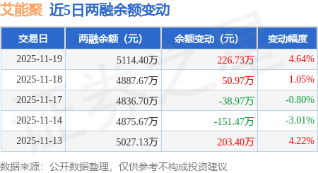 证券之星消息,11月19日,艾能聚(920770)融资买入638.47万元,融资偿还411.75万元,融资净买入226.73万元,融资余额5114.4万元,近20个交易日中有11个交易日出现融资净买入。