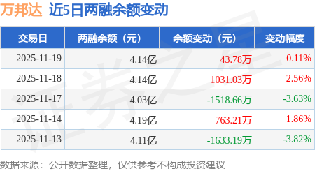 证券之星消息,11月19日,万邦达(300055)融资买入3818.52万元,融资偿还3774.19万元,融资净买入44.33万元,融资余额4.14亿元,近20个交易日中有13个交易日出现融资净买入。