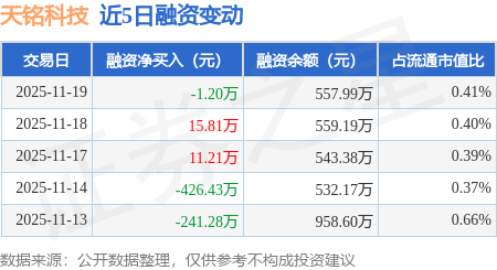 证券之星消息,11月19日,天铭科技(920270)融资买入100.17万元,融资偿还101.38万元,融资净卖出1.2万元,融资余额557.99万元。