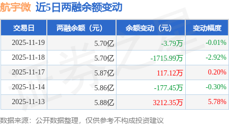 证券之星消息,11月19日,航宇微(300053)融资买入2912.17万元,融资偿还2915.82万元,融资净卖出3.65万元,融资余额5.7亿元。